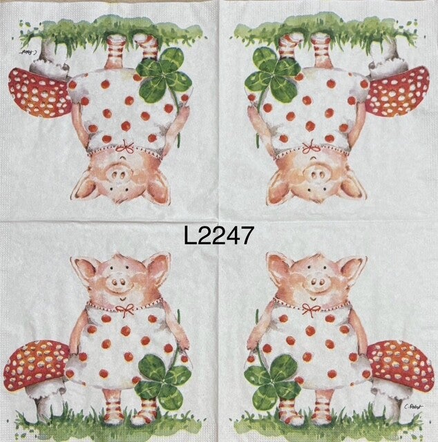 Animals (L2247) - Pig Holding a 4 Leaf Clover and a Standing Next to a Red Mushroom