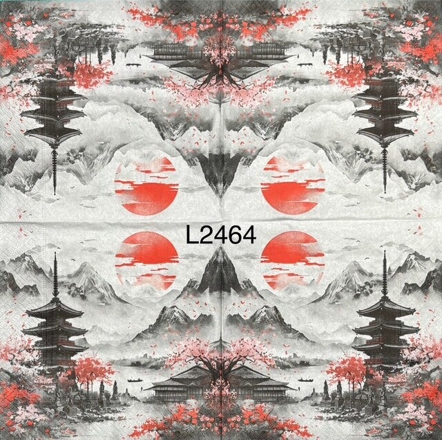 Oriental (L2464) - View of Building and Mountains in Black and White with Red Highlighting Trees and Sun